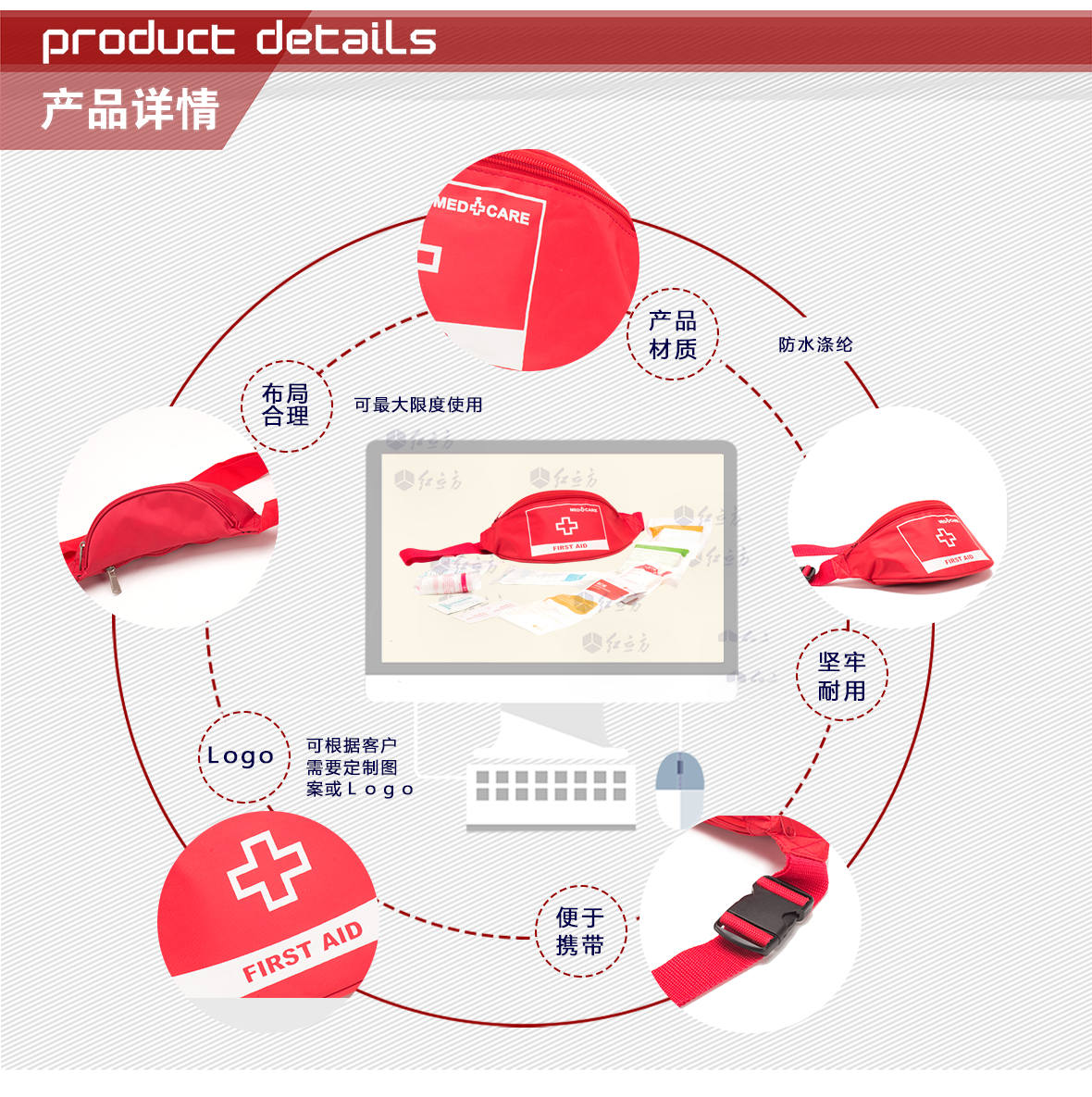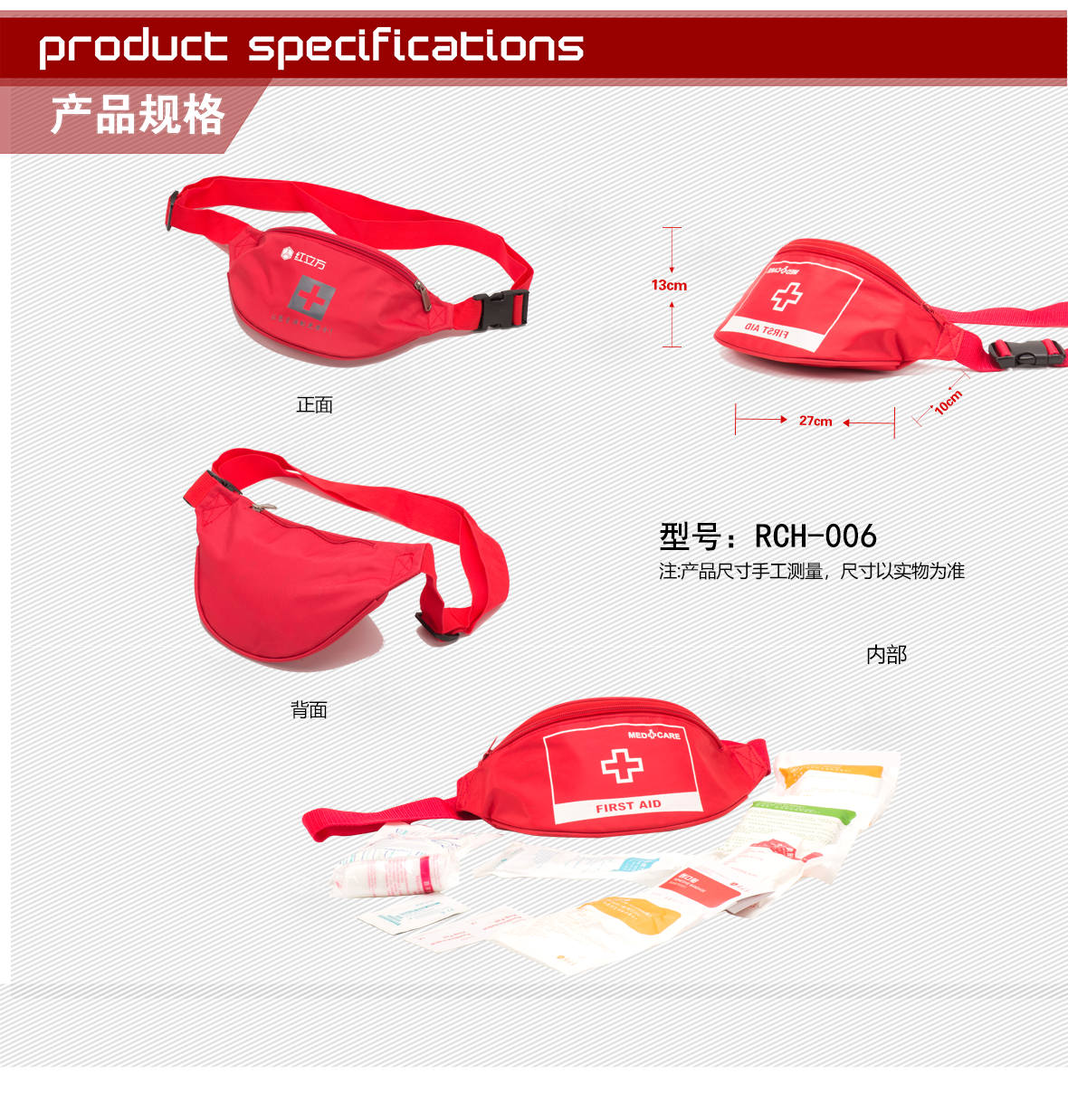 | 型號:RCH-006戶外急救包 | 外 包材質(zhì):滌綸 | 顏色:紅色 | ||||||